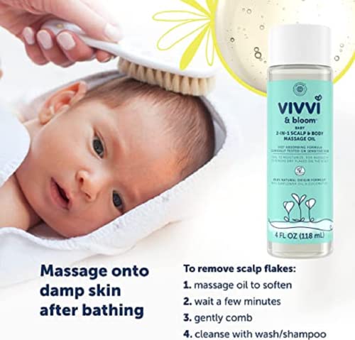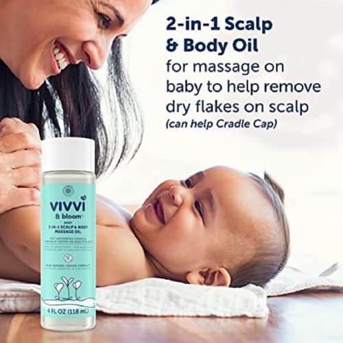4-fluid ounce bottle of Vivvi & Bloom Gentle 2-in-1 Baby Scalp & Body Massage Oil with a fast absorbing formula that has been clinically tested on sensitive skin and is ideal for moisturizing, for massage & to remove dry scalp flakes